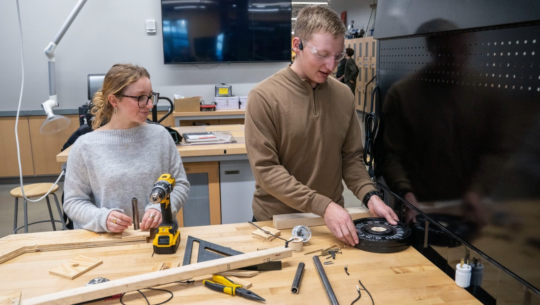 A photo of an engineering student working with wood panels
