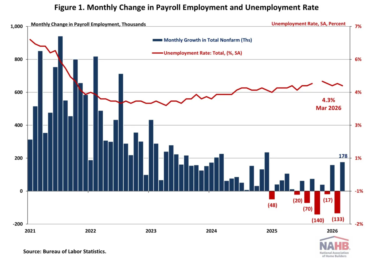 Despite March’s rebound, job growth in early 2026 remains well below 2024 levels but better than the 2025 pace. Through March, monthly payroll gains have averaged 68,000, compared with 10,000 per month in 2025 and 122,000 in 2024.