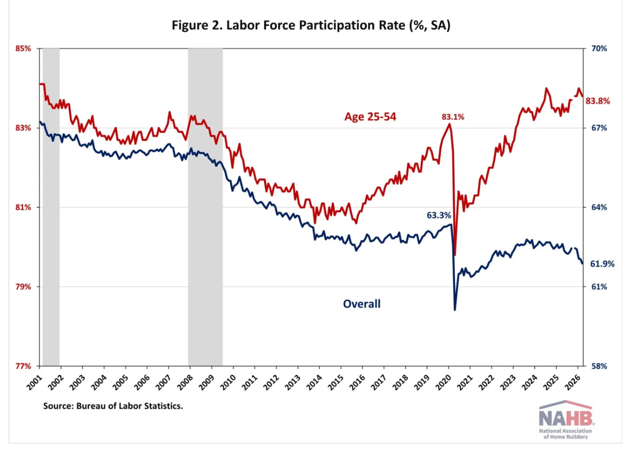 Meanwhile, the labor force participation rate—the proportion of the population either looking for a job or already holding a job—declined 0.2 percentage points to 61.9%. This marks the lowest level since December 2021 and remains below its pre-pandemic level of 63.3% recorded at the beginning of 2020. Among prime working-age individuals (aged 25 to 54), the participation rate also edged down to 83.8%.