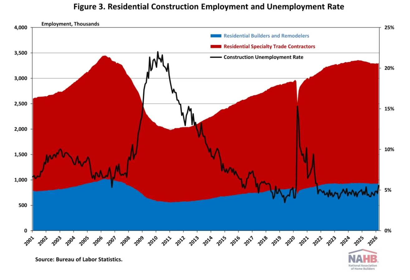 Residential construction employment now stands at 3.3 million in March, including 932,000 workers employed by builders and remodelers and nearly 2.4 million residential specialty trade contractors.