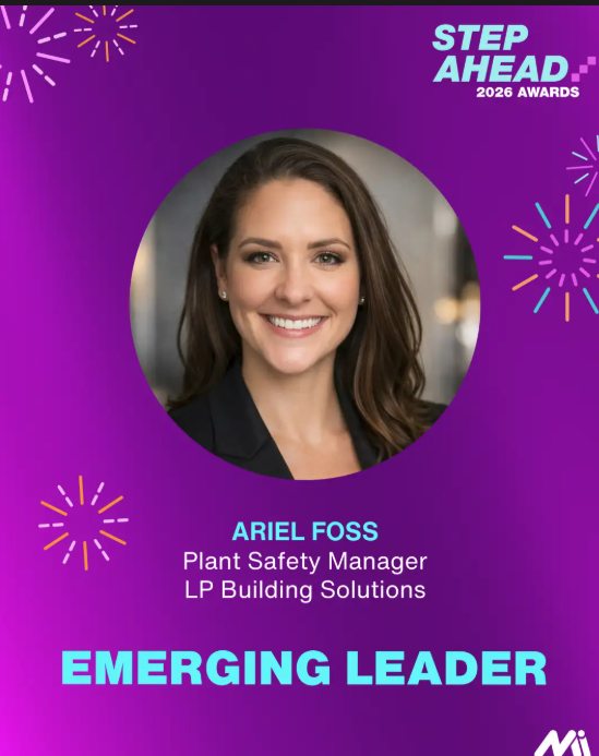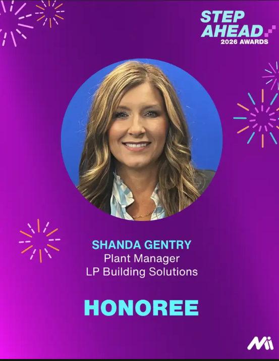 The Manufacturing Institute has released their annual STEP Ahead Awards list, which recognizes outstanding women and allies in manufacturing who are driving impact from the shop floor to the C-suite. This year, Shanda Gentry, plant manager at LP’s Roaring River facility in North Carolina, was named a 2026 STEP Ahead Honoree, and Ariel Foss, safety manager at LP’s mill in Houlton, Maine, was named a 2026 STEP Ahead Emerging Leader.
